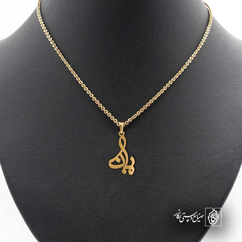 گردنبند بمان کد 6378 از جنس استیل ضدزنگ و ضد حساسیت با رنگ ثابت توسط زیورآلات نگار طراحی و ساخته شده است. این گردنبند با ضخامت 1 میلیمتر در ابعاد 2.5 تا 4 سانتیمتر نسبت به سفارش مشتری قابل ساخت است. تمام محصولات در فروشگاه زیورآلات نگار بعد از خرید ساخته میشود و بین 7 تا 15 روز به دست شما مشتریان گرامی میرسد.