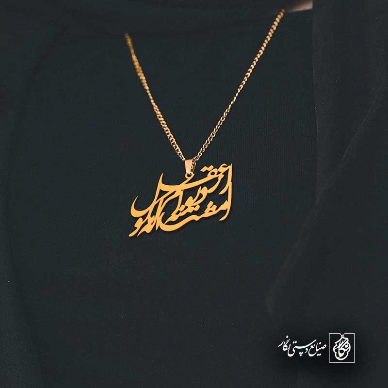 گردنبند شعر از عقل مگو که دیوانم امشب کد 6679 از جنس استیل ضدزنگ و ضد حساسیت با رنگ ثابت توسط زیورآلات نگار طراحی و ساخته شده است. این گردنبند با ضخامت 1 میلیمتر در ابعاد 2.5 تا 4 سانتیمتر نسبت به سفارش مشتری قابل ساخت است. تمام محصولات در فروشگاه زیورآلات نگار بعد از خرید ساخته میشود و بین 7 تا 15 روز به دست شما مشتریان گرامی میرسد.