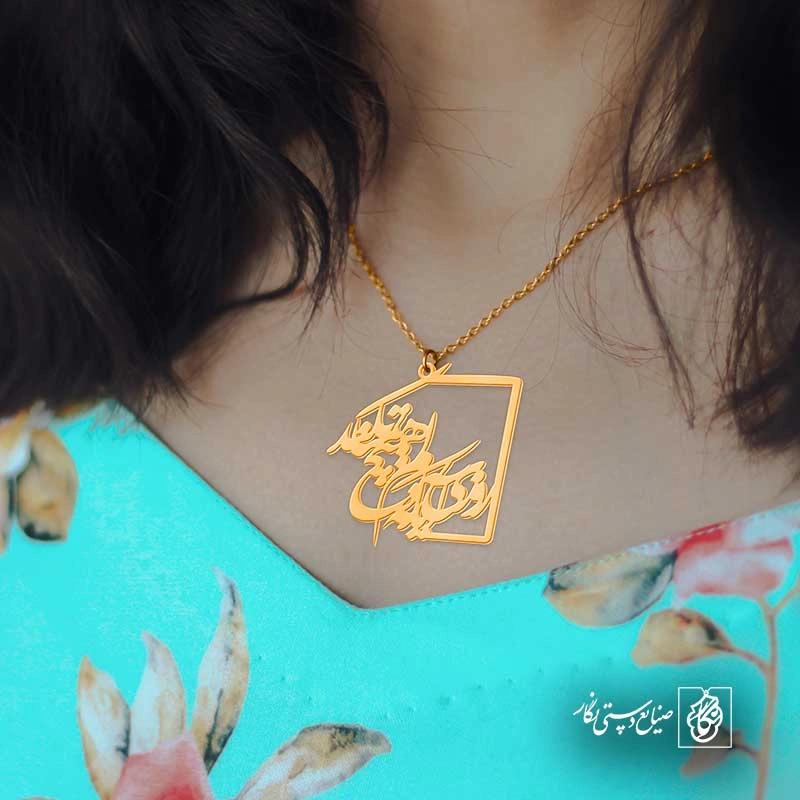 گردنبند شعر روزی آید که دلم هیچ تمنا نکند کد 6767 از جنس استیل ضدزنگ و ضد حساسیت با رنگ ثابت توسط زیورآلات نگار طراحی و ساخته شده است. این گردنبند با ضخامت 1 میلیمتر در ابعاد 2.5 تا 4 سانتیمتر نسبت به سفارش مشتری قابل ساخت است. تمام محصولات در فروشگاه زیورآلات نگار بعد از خرید ساخته میشود و بین 7 تا 15 روز به دست شما مشتریان گرامی میرسد.