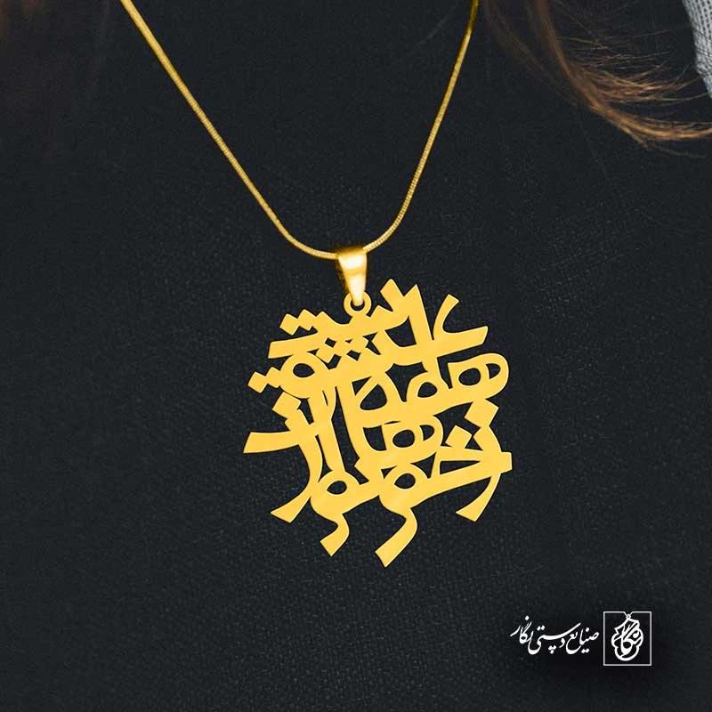 گردنبند شعر زخم هایم همه از عشق است کد 6780 از جنس استیل ضدزنگ و ضد حساسیت با رنگ ثابت توسط زیورآلات نگار طراحی و ساخته شده است. این گردنبند با ضخامت 1 میلیمتر در ابعاد 2.5 تا 4 سانتیمتر نسبت به سفارش مشتری قابل ساخت است. تمام محصولات در فروشگاه زیورآلات نگار بعد از خرید ساخته میشود و بین 7 تا 15 روز به دست شما مشتریان گرامی میرسد.
