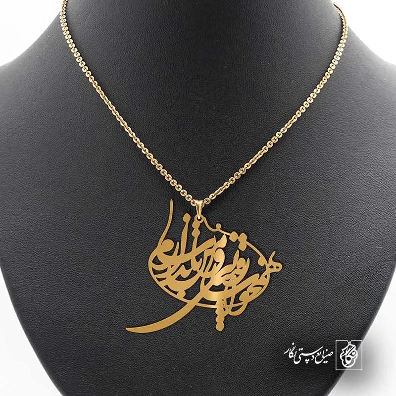گردنبند شعر همخواب رقیبان و من تاب ندارم کد 6787 از جنس استیل ضدزنگ و ضد حساسیت با رنگ ثابت توسط زیورآلات نگار طراحی و ساخته شده است. این گردنبند با ضخامت 1 میلیمتر در ابعاد 2.5 تا 4 سانتیمتر نسبت به سفارش مشتری قابل ساخت است. تمام محصولات در فروشگاه زیورآلات نگار بعد از خرید ساخته میشود و بین 7 تا 15 روز به دست شما مشتریان گرامی میرسد.