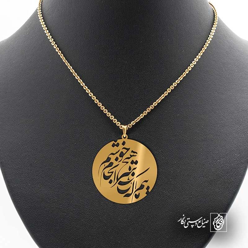 گردنبند شعر ماییم که بی هیچ سرانجام خوشیم کد 6967 از جنس استیل ضدزنگ و ضد حساسیت با رنگ ثابت توسط زیورآلات نگار طراحی و ساخته شده است. این گردنبند با ضخامت 1 میلیمتر در ابعاد 2.5 تا 4 سانتیمتر نسبت به سفارش مشتری قابل ساخت است. تمام محصولات در فروشگاه زیورآلات نگار بعد از خرید ساخته میشود و بین 7 تا 15 روز به دست شما مشتریان گرامی میرسد.
