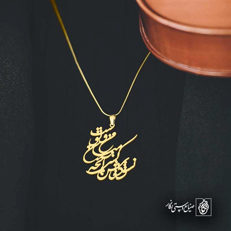 گردنبند شعر نشود فاش کسی آن چه میان من و توست کد 6975 از جنس استیل ضدزنگ و ضد حساسیت با رنگ ثابت توسط زیورآلات نگار طراحی و ساخته شده است. این گردنبند با ضخامت 1 میلیمتر در ابعاد 2.5 تا 4 سانتیمتر نسبت به سفارش مشتری قابل ساخت است. تمام محصولات در فروشگاه زیورآلات نگار بعد از خرید ساخته میشود و بین 7 تا 15 روز به دست شما مشتریان گرامی میرسد.