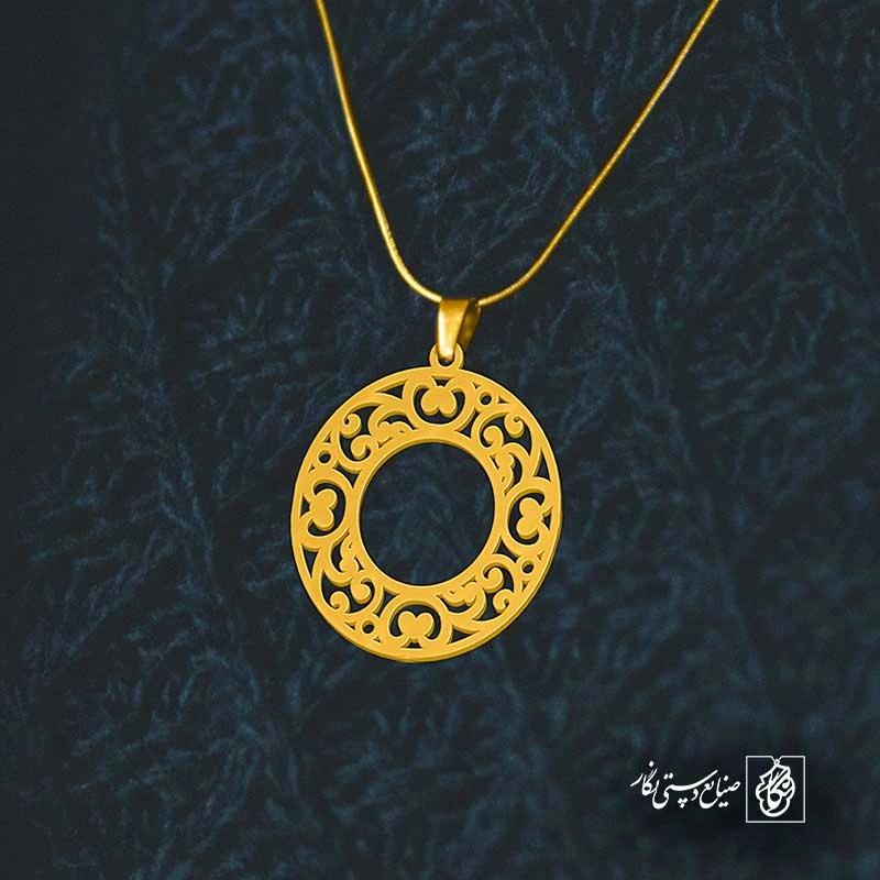 گردنبند اسلیمی دایره کد 41537 از جنس استیل ضدزنگ و ضد حساسیت با رنگ ثابت توسط زیورآلات نگار طراحی و ساخته شده است. این گردنبند با ضخامت 1 میلیمتر در ابعاد 2.5 تا 4 سانتیمتر نسبت به سفارش مشتری قابل ساخت است. تمام محصولات در فروشگاه زیورآلات نگار بعد از خرید ساخته میشود و بین 7 تا 15 روز به دست شما مشتریان گرامی میرسد.