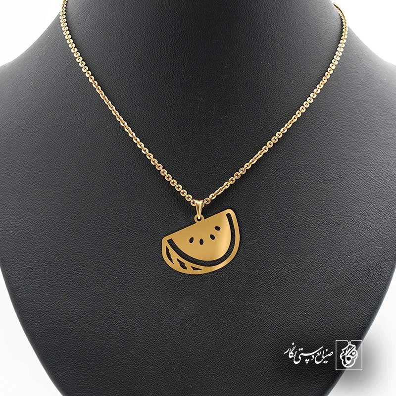 گردنبند هندونه کد 42643 از جنس استیل ضدزنگ و ضد حساسیت با رنگ ثابت توسط زیورآلات نگار طراحی و ساخته شده است. این گردنبند با ضخامت 1 میلیمتر در ابعاد 2.5 تا 4 سانتیمتر نسبت به سفارش مشتری قابل ساخت است. تمام محصولات در فروشگاه زیورآلات نگار بعد از خرید ساخته میشود و بین 7 تا 15 روز به دست شما مشتریان گرامی میرسد.