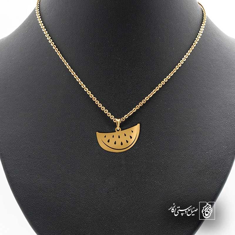 گردنبند هندونه کد 42645 از جنس استیل ضدزنگ و ضد حساسیت با رنگ ثابت توسط زیورآلات نگار طراحی و ساخته شده است. این گردنبند با ضخامت 1 میلیمتر در ابعاد 2.5 تا 4 سانتیمتر نسبت به سفارش مشتری قابل ساخت است. تمام محصولات در فروشگاه زیورآلات نگار بعد از خرید ساخته میشود و بین 7 تا 15 روز به دست شما مشتریان گرامی میرسد.