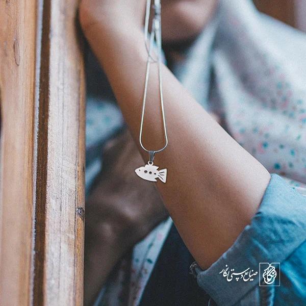 گردنبند ماهی کد 1400 از جنس استیل ضدزنگ و ضد حساسیت با رنگ ثابت توسط زیورآلات نگار طراحی و ساخته شده است. این گردنبند با ضخامت 1 میلیمتر در ابعاد 2.5 تا 4 سانتیمتر نسبت به سفارش مشتری قابل ساخت است.