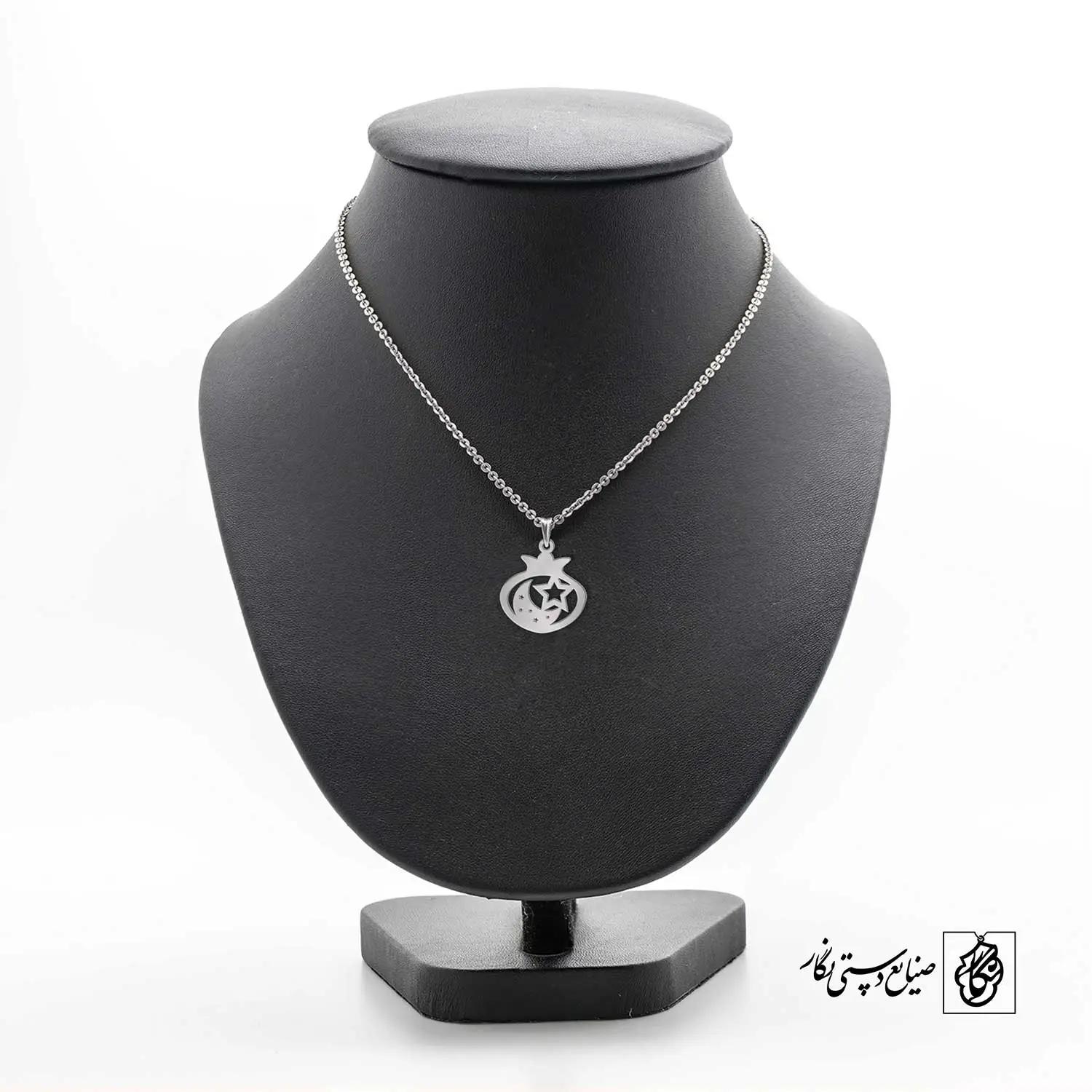 گردنبند انار ماه ستاره کد 40387 از جنس استیل ضدزنگ و ضد حساسیت با رنگ ثابت توسط زیورآلات نگار طراحی و ساخته شده است. این گردنبند با ضخامت 1 میلیمتر در ابعاد 2.5 تا 4 سانتیمتر نسبت به سفارش مشتری قابل ساخت است. تمام محصولات در فروشگاه زیورآلات نگار بعد از خرید ساخته خواهد شد و بین 7 تا 15 روز به دست مشتریان گرامی خواهد رسید.