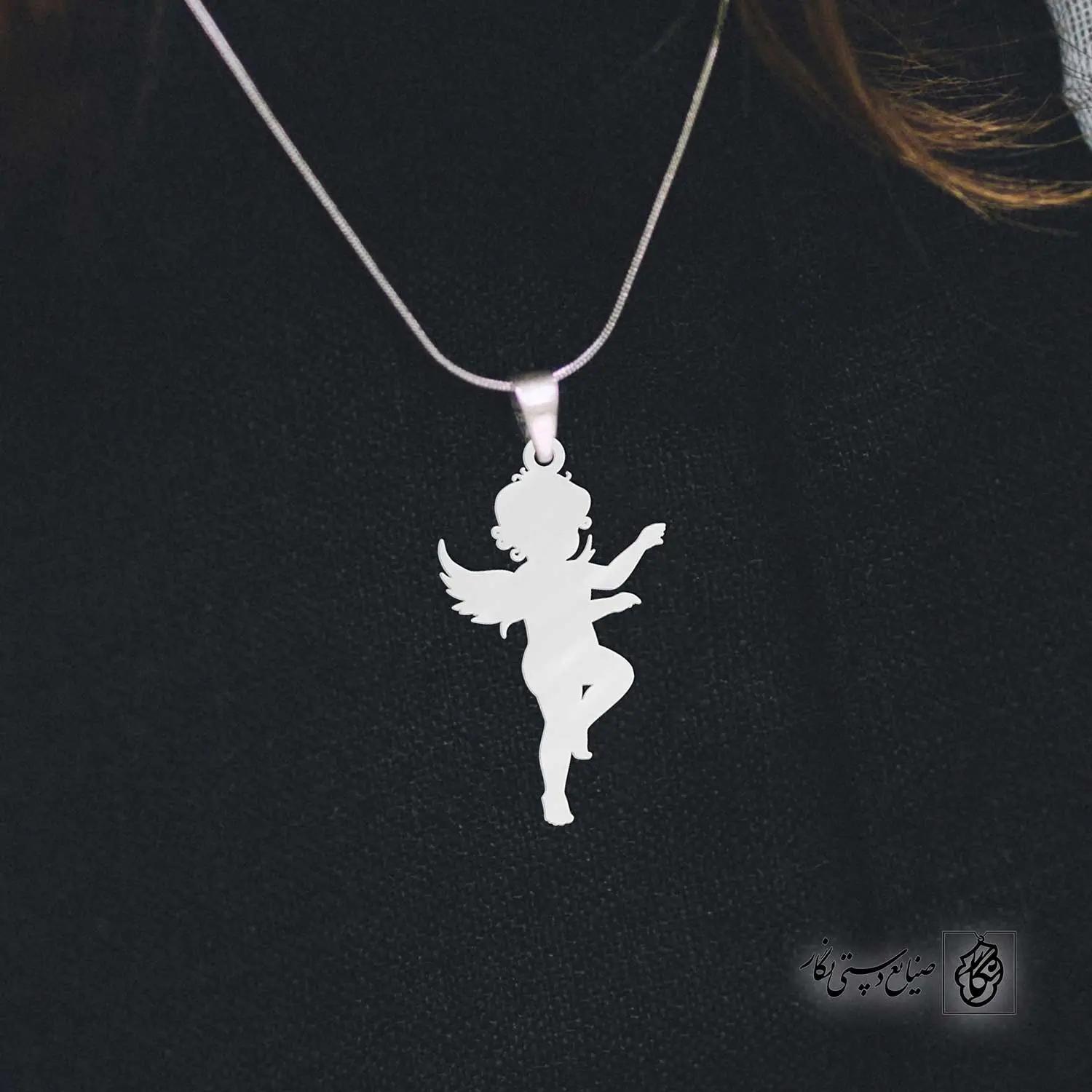 گردنبند فرشته کد 40497 از جنس استیل ضدزنگ و ضد حساسیت با رنگ ثابت توسط زیورآلات نگار طراحی و ساخته شده است. این گردنبند با ضخامت 1 میلیمتر در ابعاد 2.5 تا 4 سانتیمتر نسبت به سفارش مشتری قابل ساخت است. تمام محصولات در فروشگاه زیورآلات نگار بعد از خرید ساخته خواهد شد و بین 7 تا 15 روز به دست مشتریان گرامی خواهد رسید.