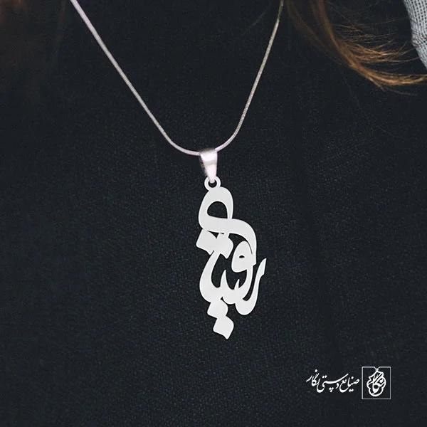 گردنبند اسم رقیه کد 3018 از جنس استیل ضدزنگ و ضد حساسیت با رنگ ثابت توسط زیورآلات نگار طراحی و ساخته شده است. این گردنبند با ضخامت 1 میلیمتر در ابعاد 2.5 تا 4 سانتیمتر نسبت به سفارش مشتری قابل ساخت است. تمام محصولات در فروشگاه زیورآلات نگار بعد از خرید ساخته خواهد شد و بین 7 تا 15 روز به دست مشتریان گرامی خواهد رسید.