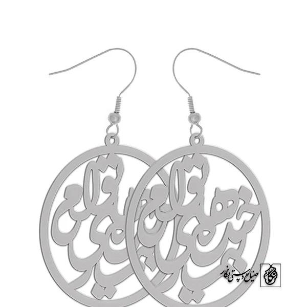 گوشواره شعر بیمار خنده های توام کد 403 از جنس استیل ضدزنگ و ضد حساسیت با رنگ ثابت توسط زیورآلات نگار طراحی و ساخته شده است. این گردنبند با ضخامت 1 میلیمتر در ابعاد 2.5 تا 4 سانتیمتر نسبت به سفارش مشتری قابل ساخت است.
